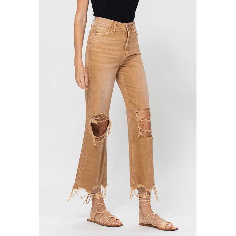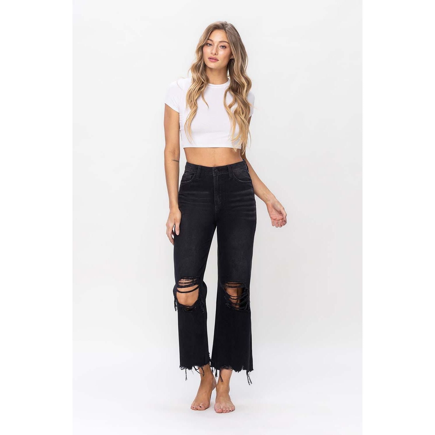 Expertly crafted to replicate the look of 90s vintage denim with a modern flare. these 90's Vintage Crop Flare jeans are perfect for those seeking a timeless style. High waisted and cropped length with a relaxed fit. the jeans provide a trendy aesthetic with the distressed detail. Crafted from non-stretch denim and featuring an authentic rigid jean texture. they will serve you for years without losing its shape.