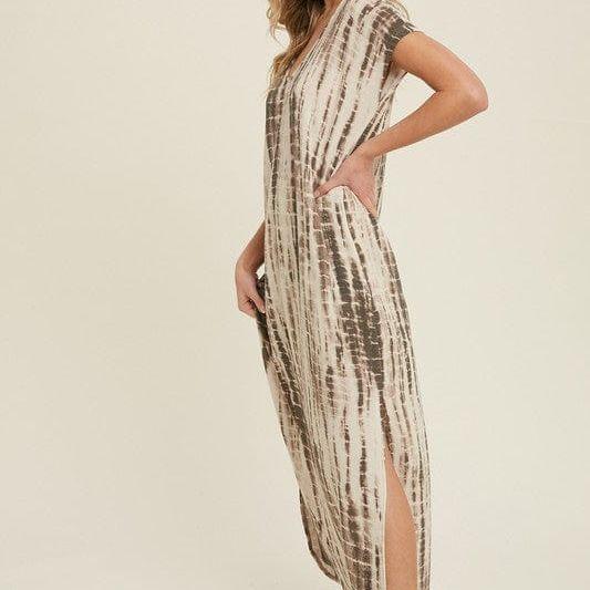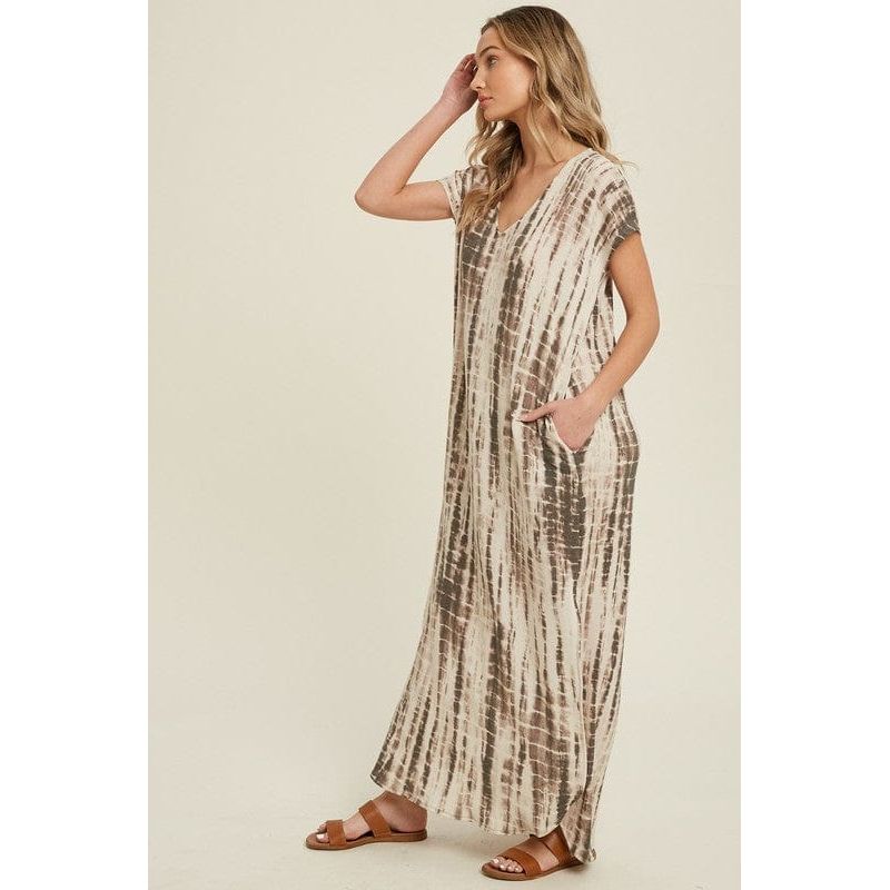 Tie-dye casual maxi jersey dress featuring v-neckline. short sleeves. side pockets. and side slits on both sides. Wear it casual and long or add a knot at the bottom for a more stylish look.