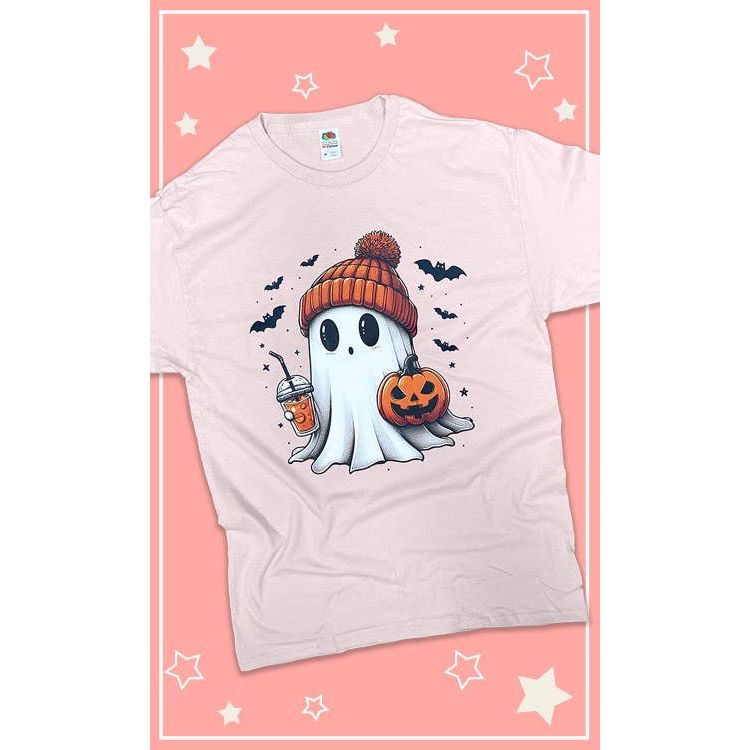 Batty Ghost Graphic T-Shirt100% cotton blush pink graphic t-shirt.This graphic t-shirt's design features an illustration of an adorable ghost holding a jack-o-lantern and a pumpkin spice beverage. wearing an orange knitted cap. and surrounded by little bats. This top is perfect for Halloween season!Application: The graphic of this top is applied using a direct-to-film (DTF) printing method. which is then transferred to the garment.Sizing Hint: This is a basic unisex tee. which fits true to size. See additional images for sizing charts.Care Instructions: Machine wash cold. Do not bleach. Tumble dry medium. Do not dry clean.