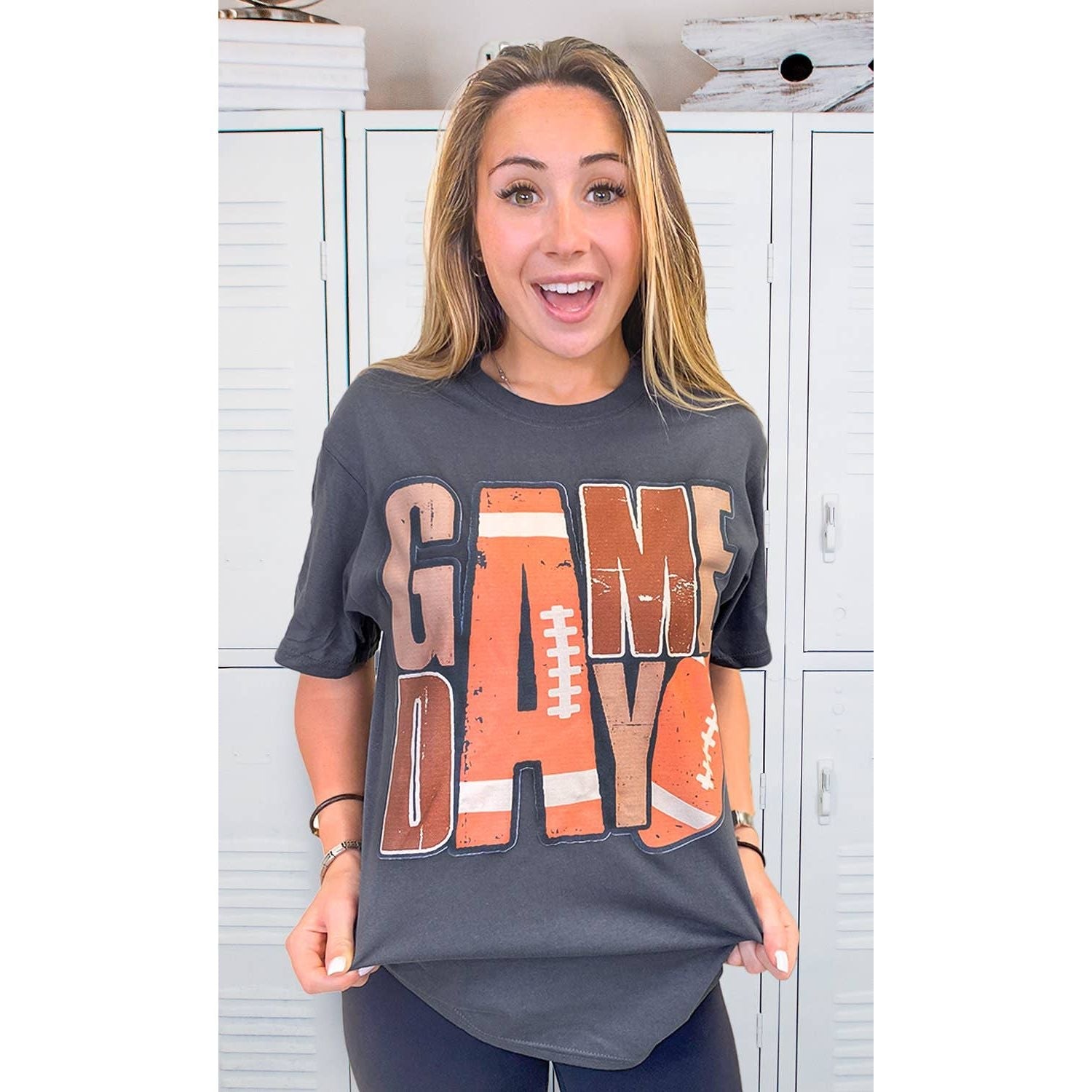 Game Day Stacked Football Shirt100% cotton charcoal grey t-shirt.This graphic t-shirt's distressed design features the words "GAME DAY" stacked onto two lines. with footballs incorporated in the design. This top is perfect for football game day!Sizing Hint: This is a basic unisex tee. which fits true to size. See additional images for sizing charts.Care Instructions: Machine wash cold. Do not bleach. Tumble dry medium. Do not dry clean.