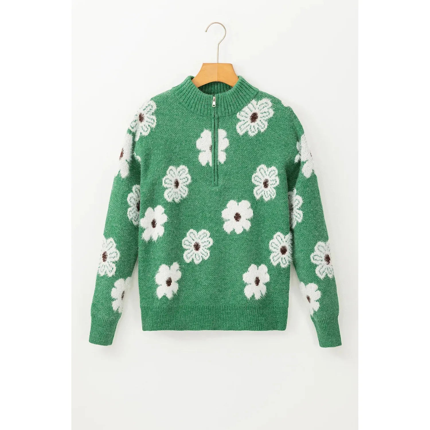 Green Floral Pattern Half Zip Drop Shoulder Sweater
