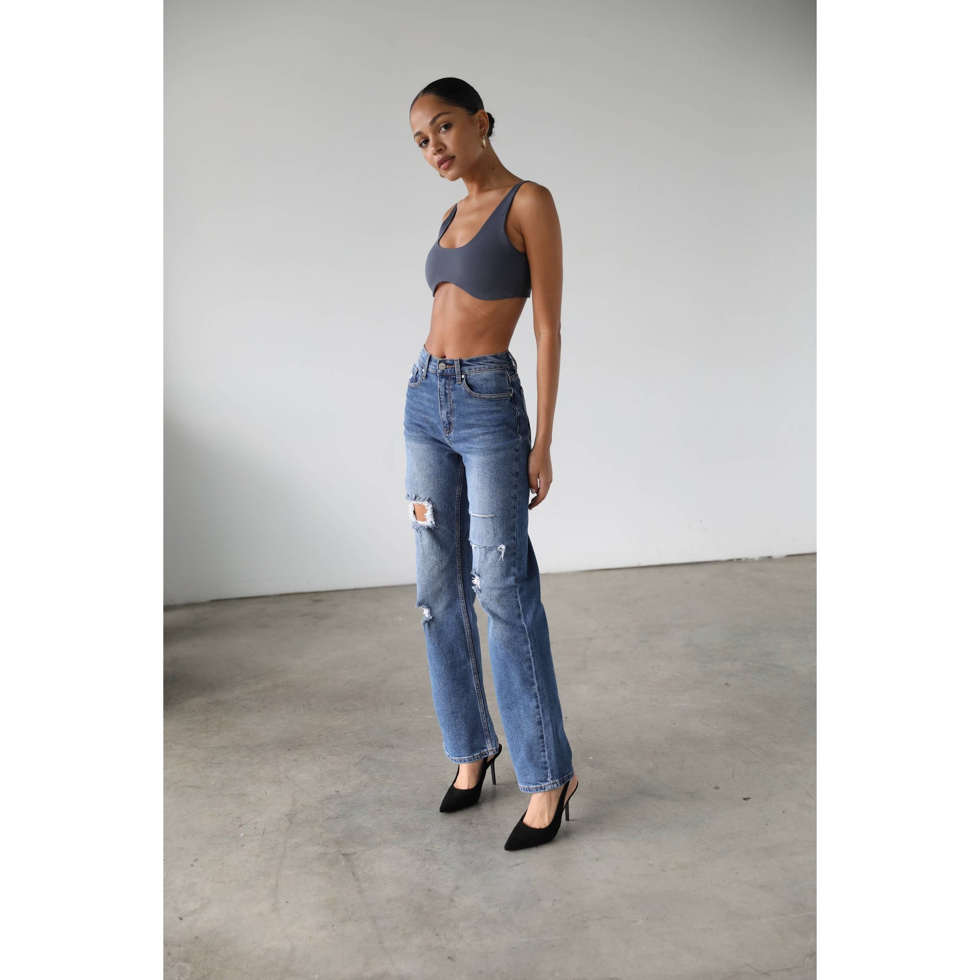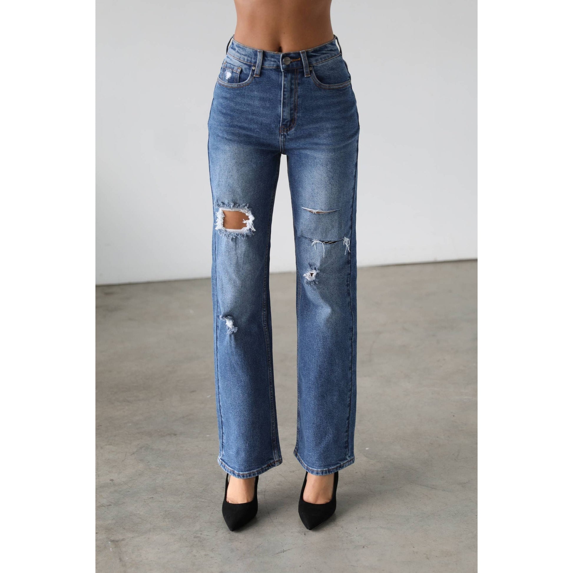 High Rise Straight Leg Denim Jeans - Dark- 7106
