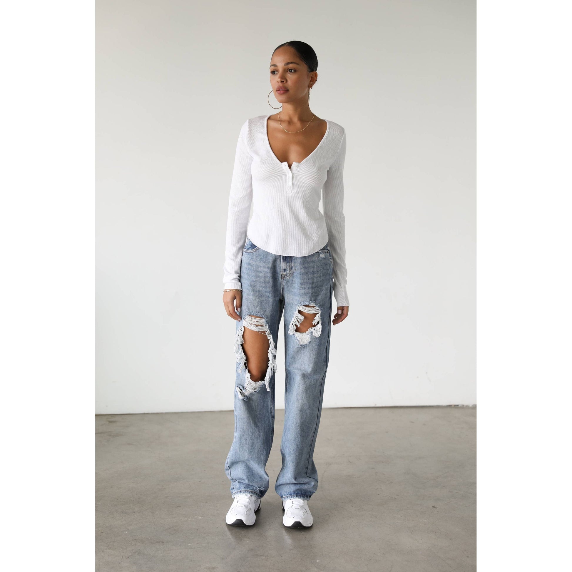 Our Dogma High Rise Straight Wide Leg Denim Jeans are perfect for an effortless look combined with a relaxed fit. These jeans feature a high-rise waist and straight. wide legs for a timeless silhouette. Comfortably stylish.Straight Wide Leg Skater Denim JeansNon-Stretch Denim5 PocketsButton And Zipper ClosureRise: 12 1/2" Inseam: 33"