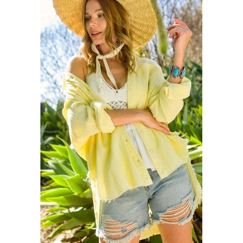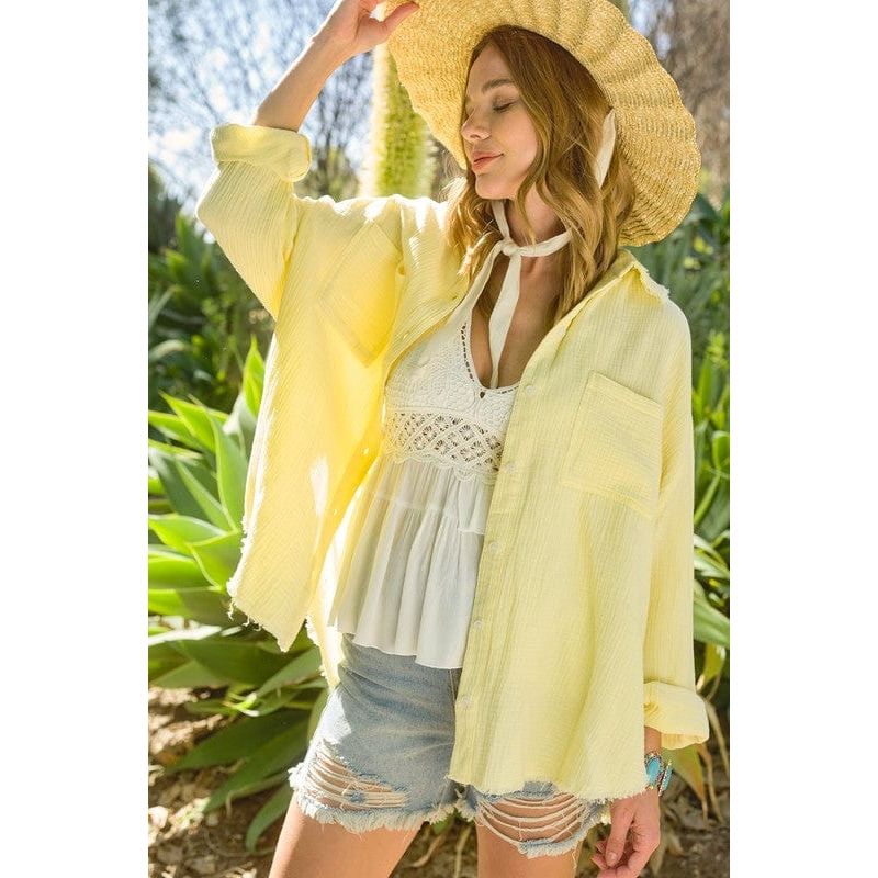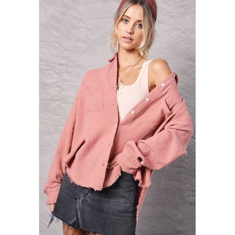 She's a cool and classic button down shirt. Otto shirt is an oversized. slouchy silhouette in a gorgeous crinkled gauze with dual front pockets. The raw hemline makes it the most effortless style no matter the season. It will be your year-round favorite!