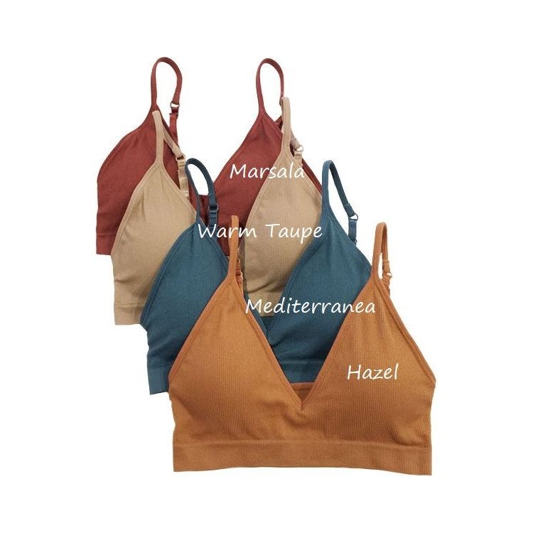 Seamless ribbed bralette deep V-neck silhouette. With thin adjustable shoulder straps. pullover style. and removable padding. 88% Nylon. 12% Spandex
