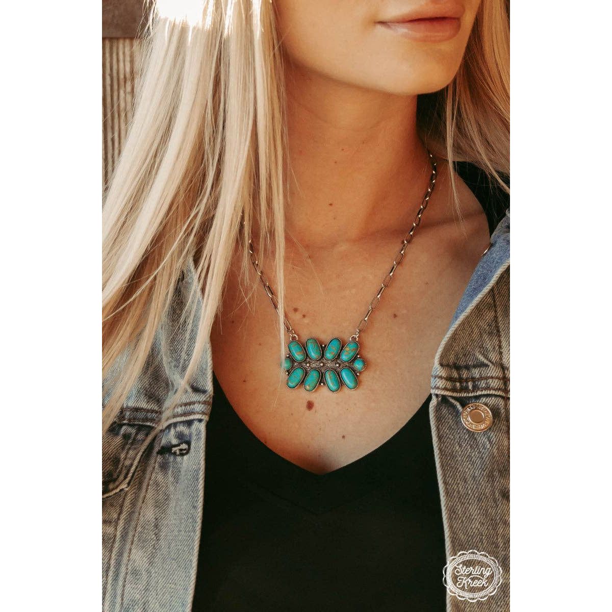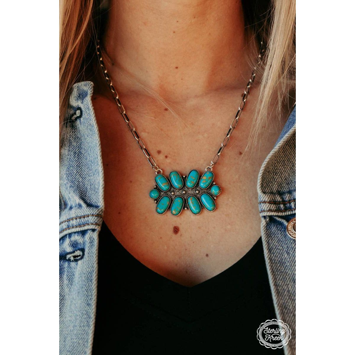 "Get ready to wrangle some style with our Rodeo Roots set! This unique. rectangle-shaped dangle features 10 gorgeous turquoise stones. paired with a silver paperclip chain for a playful touch. Complete the look with the matching earring studs. featuring 4 turquoise stones. Yee-haw!"Necklace: 9.5" adjustable chain: 3"Earrings: 1"