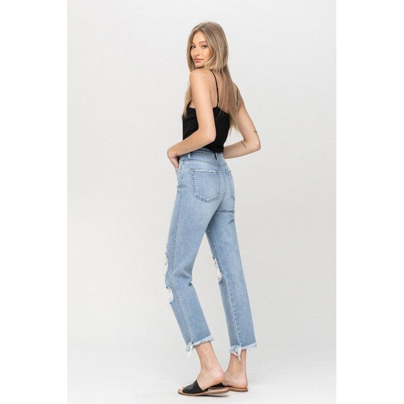 - non stretch denim. distressed detail. relaxed legs. straight fit. loose style. hidden buttons up. super high-waisted. relaxed straight. authentic rigid jeans texture. deconstructed and vintage with hem