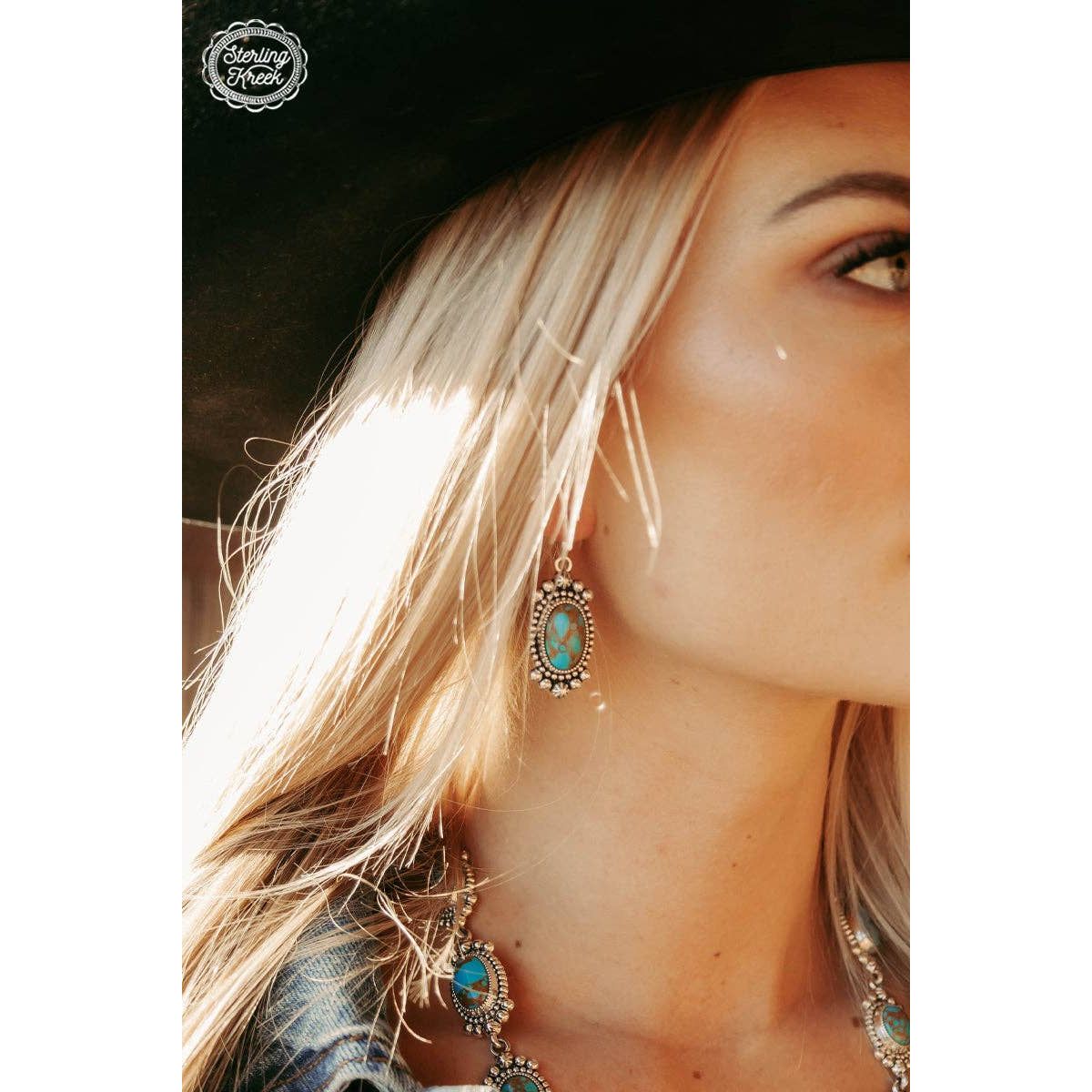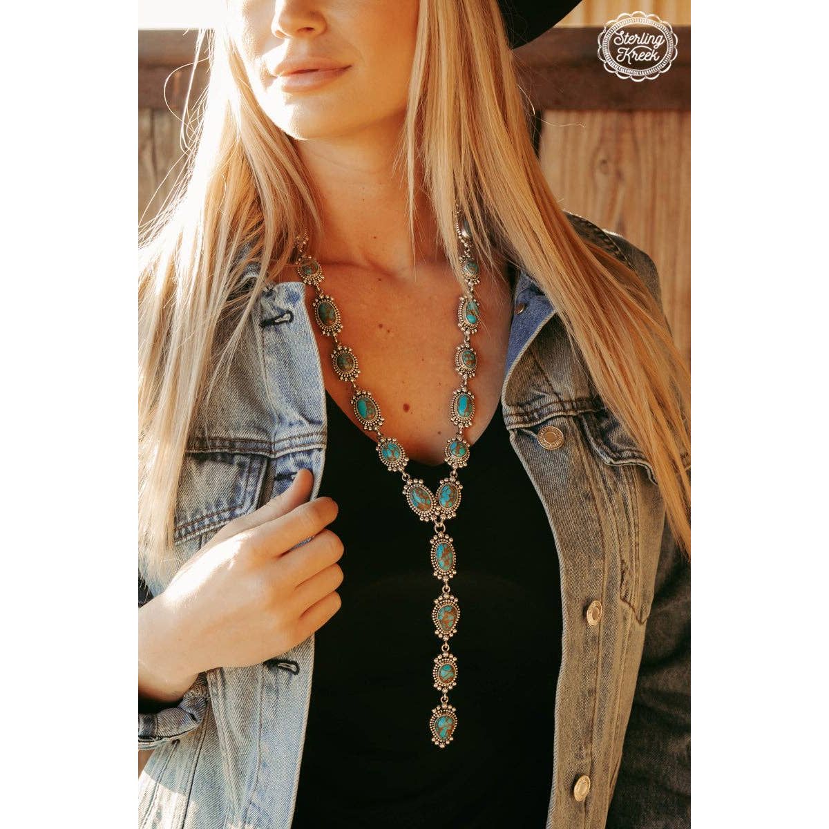 "Turn heads with the Texas Bay necklace! Vibrant turquoise stones (16 on the necklace. 4 dangling in the middle) make this accessory pop. Complete your look with the matching earrings. Stand out with this stunning set!"Length: 19.5"Adjustable chain: 3"Earring: 1.5"