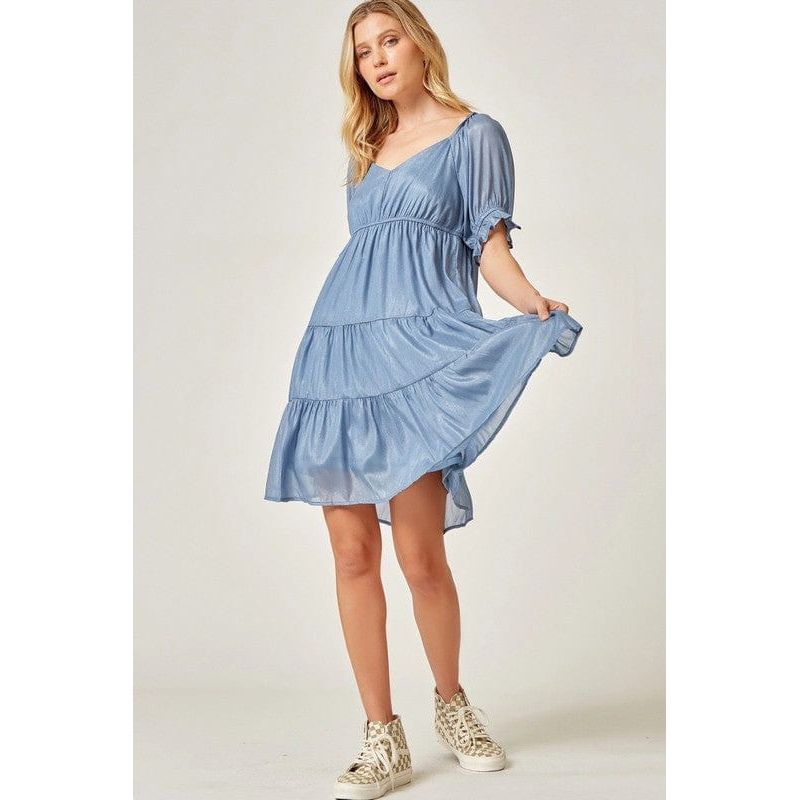 Babydoll tiered dress with shimmery fabrication! This dress features a sweetheart neckline. puff sleeves with empire bustline. Slightly shorter than our regular dresses. Lined. woven.