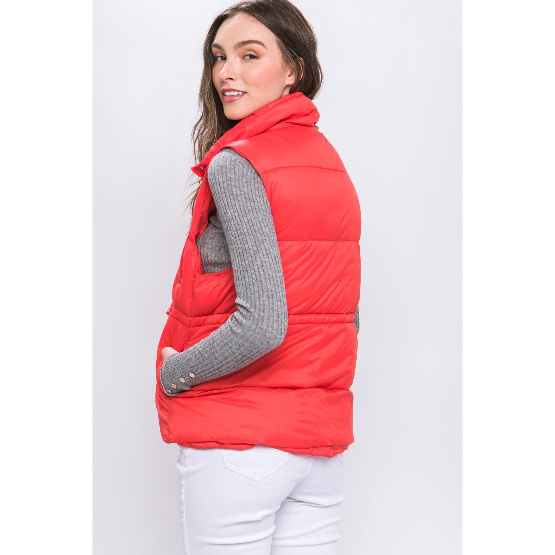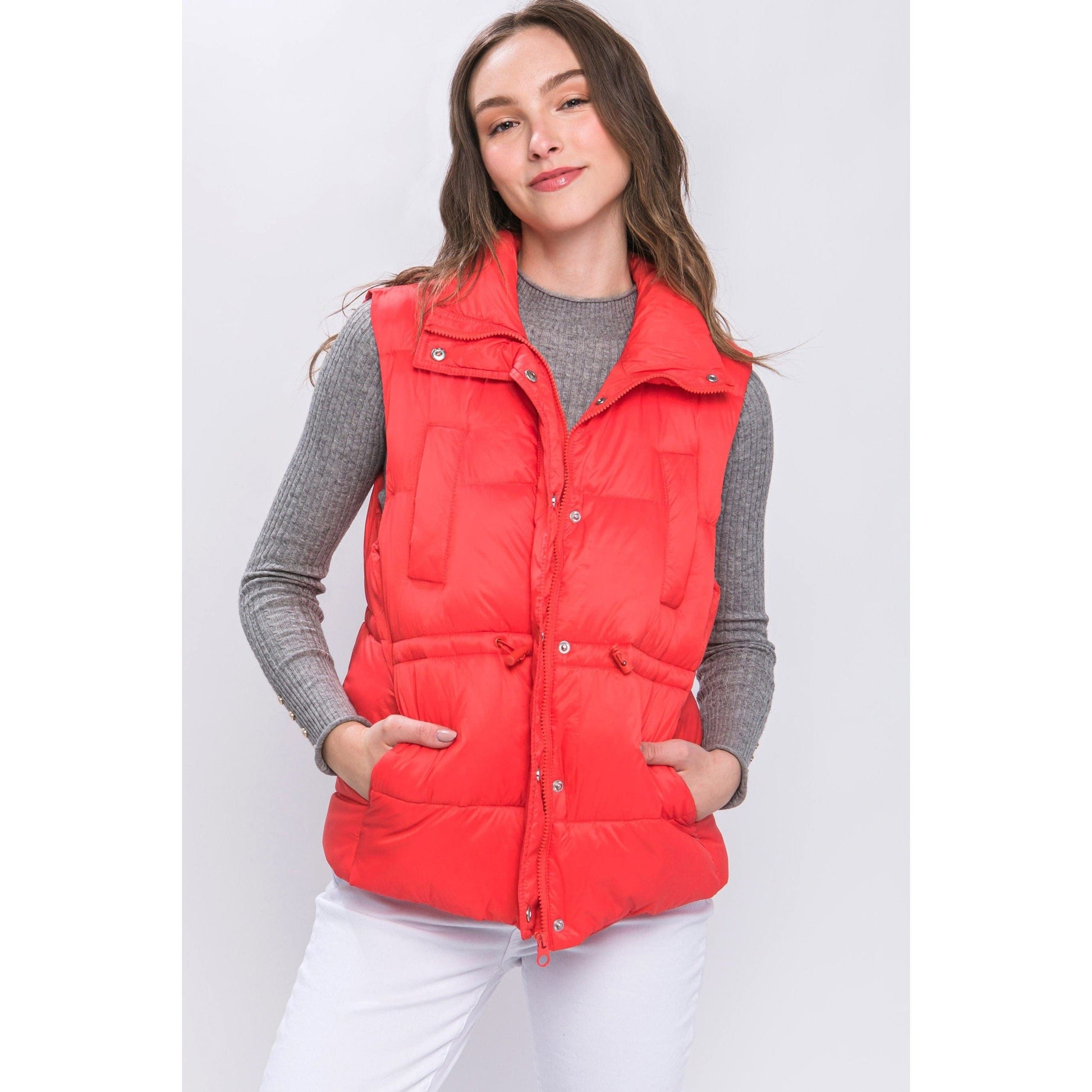 This puffer vest features waist toggles and a zip-up design for ultimate warmth and comfort. The faux leather material adds a touch of style. while the cargo and parachute details provide functionality.