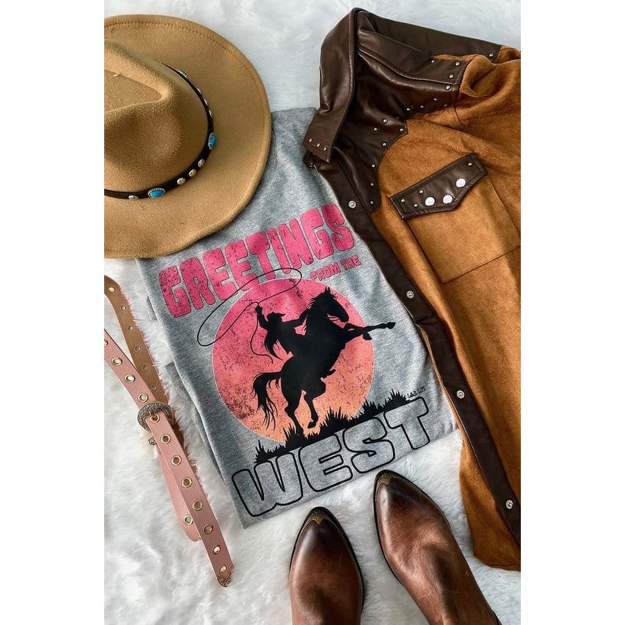 Experience the charm of the Wild West with our West Greetings T-Shirt. Featuring the iconic phrase "Greetings from the West." this shirt is a must-have for any fan of western culture. Made with high-quality materials. you can be sure this shirt will make a statement wherever you go.