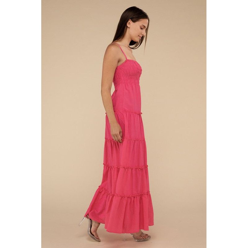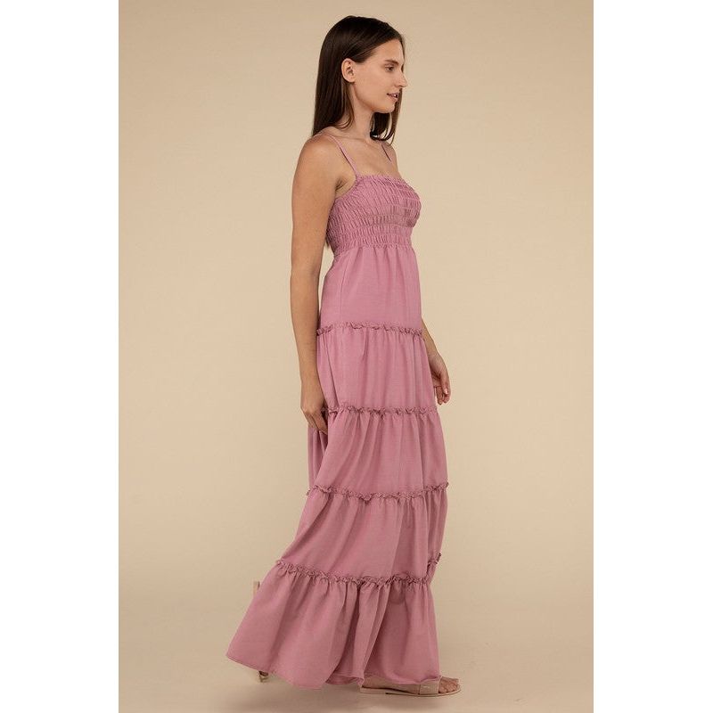 The Woven Smocked Top Tiered Cami Maxi Dress is the epitome of effortless summer style. This dress features a smocked top with adjustable spaghetti straps. ensuring a comfortable and secure fit. The tiered cami design adds a touch of whimsy and movement to the silhouette. making it perfect for beach days or casual outings.
